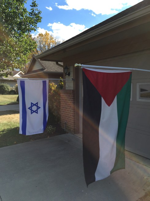On either side of my garage doors hang two flags: Palestinian and Israeli. They fly with heads bowed, both in grief over the daily violence in their land that we call holy.