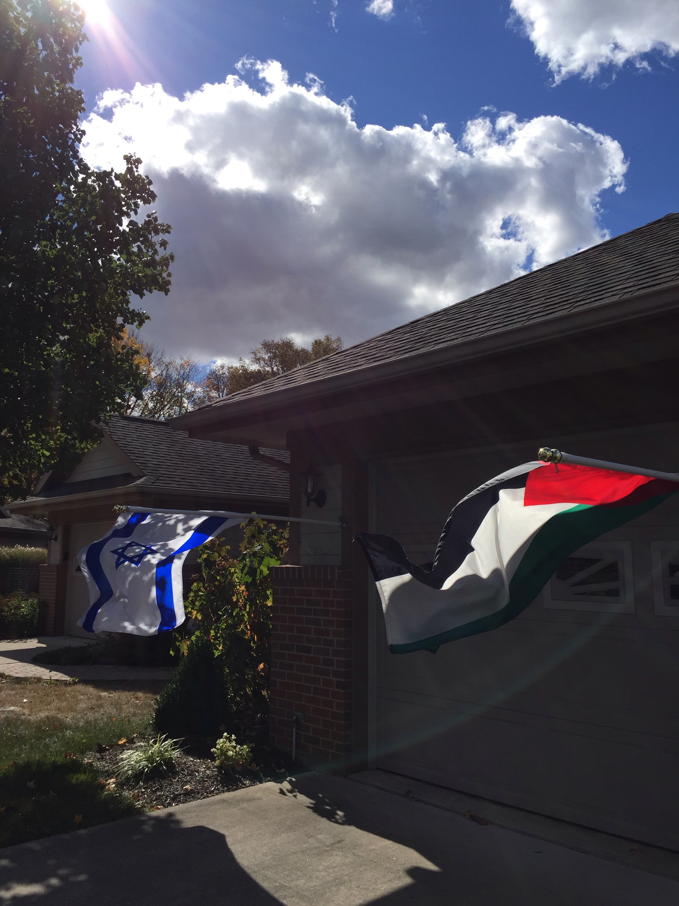 On either side of my garage doors hang two flags: Palestinian and Israeli. They fly with heads bowed, both in grief over the daily violence in their land that we call holy.