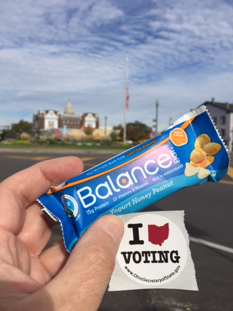 Today was the first day to vote in Ohio. Since three months ago my new home is in Miami County. The courthouse in Troy, almost ten minutes away by car, is easily accessible and easier to navigate. After voting I went to the town square, which is actually a circle, where I sat down, and prepared to enjoy my special treat. As you can see from the photo, (1) the flag is at half staff, I presume because of the nation’s mourning over another and latest school shooting, (2) the outside of the rotunda of the courthouse is in the background, (3) I “Ohio” voting, and (4) my favorite of the Balance Bars is the yogurt honey peanut.
