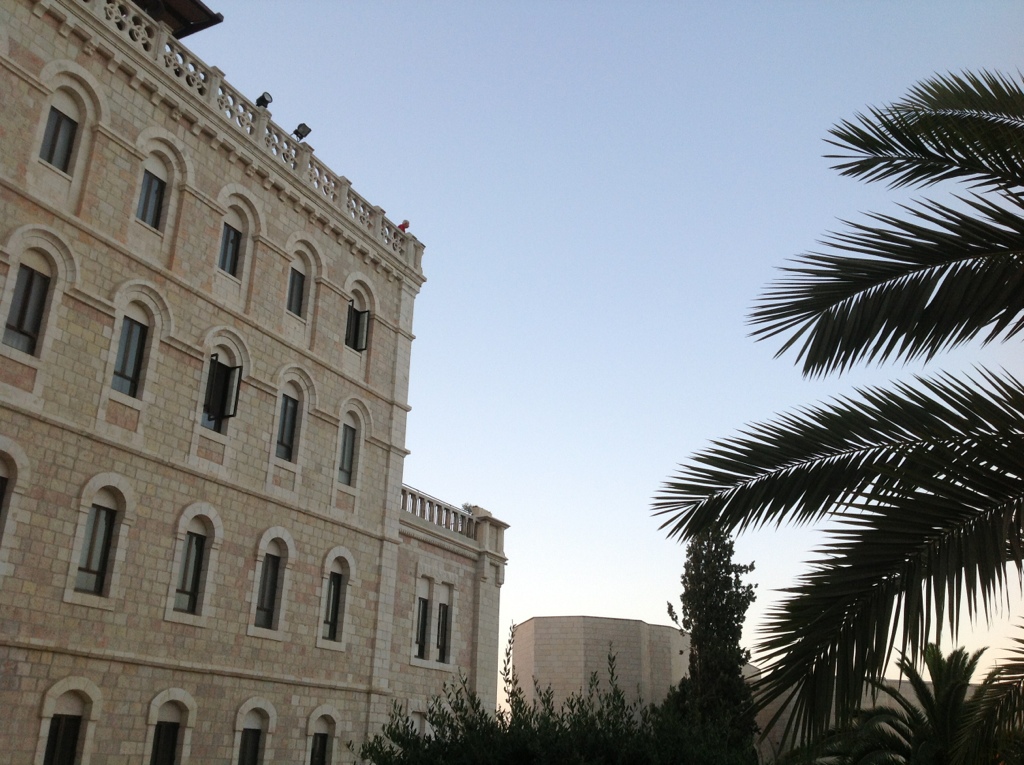 Not the top floor, but one down from the top, with my windows both open – this is where my knee and I have been spending our nights and most of our days, taking it easy and propped up. Eating lunch of chicken shwarma by myself on the veranda of the Notre Dame Center, I looked up and saw three people standing at my table, looking down at me: George, Rawan and Father Humam. They all work at the Latin Patriarchate. I have met each of them over the years in some capacity or another. They now work together. It is something, I do not know what, but it something to have three wonderful people working in this wonderful land among this wonderful people in the name of our wonderful God all recognize me and call me by name. God has been so good to me. After lunch I began reading a book about Pope Francis. The words “authenticity” and “authentic” keep coming to mind. An African priest, seeing that I was walking with a cane, said, “In Africa, as have an expression: if is it too easy, we don’t remember it!” Finally, I do not remember the origin of these next two sentences, but they appear in my journal entry for 12 June and are too good to waste: I am finding what God gives, and resting in his giving. People should be able to see our experience of God in our face, all over our face, without us saying a word.