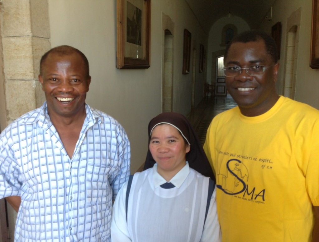 At Capernaeum I happened upon Father Jerome, the guardian of the property and of the small Franciscan community there. We have met on previous occasions. There is just himself and an 81-year old fear, who was one of the two original excavators of the ruins of Capernaeum and who hopes to be able to be allowed to die and be buried on the property. Father Jerome (on the left in the photo) is from Ghana, and has been at Capernaeum for nine years, and is at the end of his term, but hoping to be able to stay longer. That sounded familiar to me. He was visited for a few days by another priest from Ghana, of another religious order. There are three nuns living in their own convent on the grounds, serving the pilgrims in the church/sacristy and the priests in their house. Father Jerome invited me for lunch. There was good food and laughter and priestly companionship. When conversation went to our new Pope, we all smiled. The word we agreed best described Francis was “authentic,” like in genuine, real. In speaking about camaraderie among priests, I mentioned the bond that seems to exist among mothers of priests. Father Jerome remembered at that moment that it was that day, 15 June, that his mother died four years ago. The third priest was the only one at table who still had his mother. Jerome shook his finger at him, “Take care of her for as long as you have her.” It seems the mother-priest son thing is the same the world over. Father drove me home the two miles to my bed, I mean, my hotel. I am convinced that Jesus hid away from Noon until 4:00 p.m. every day, because it is plum too hot to do anything but find some shade and snooze a bit. Jerome also told me to call him, if I wanted a ride anywhere, anytime. I think my ride to the border crossing on Wednesday was just handed to me. I added Ghanaian Jerome to my Jordanian George of a previous post.