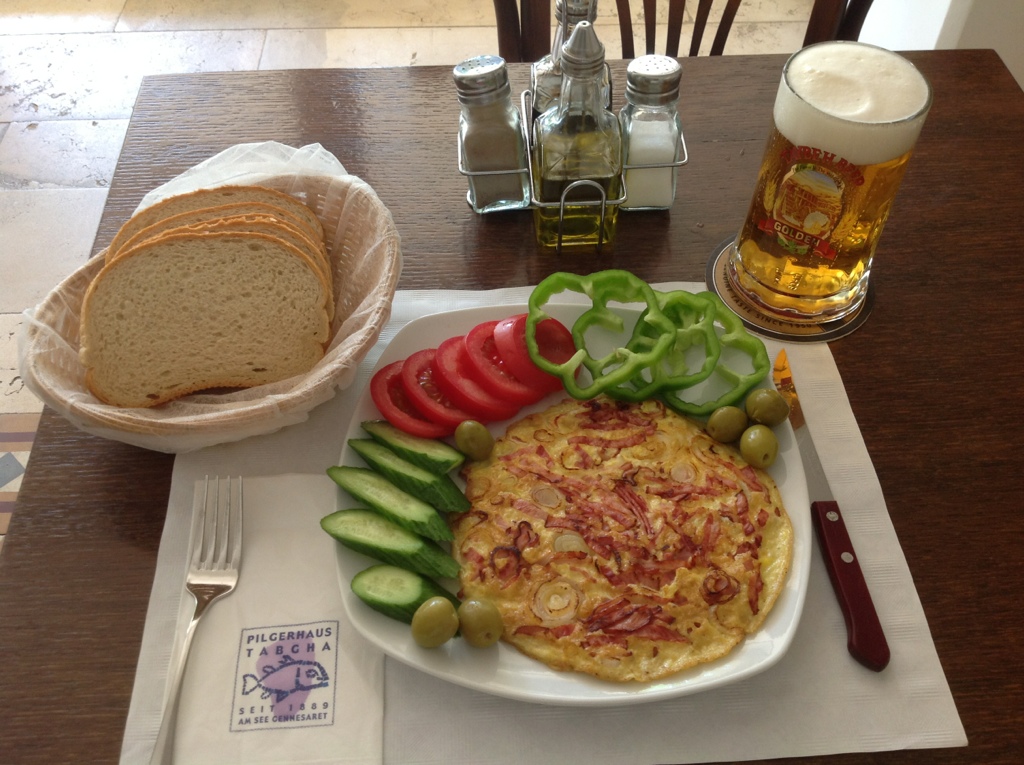 On my last full day at the Sea of Galilee I treated myself to a ham, cheese and onion omelette at the pilgrim house restaurant, with some salad and bread, as always – and a draft Taybeh beer, for a real treat. The omelette cost 28 NIS (new Israeli shekels), and the beer cost 25 NIS, the bill coming to 53 NIS, about $15 US. Taybeh is the only Palestinian-produced beer, made in a brewery in the town of, you guessed it, Taybeh, in the West Bank. Taybeh is one of the few totally Christian villages left in the Holy Land. The brewery is operated by, you guessed it, a Christian family, remember: the only kind in Taybeh. Maybe in my retirement I will open up a Taybeh beer market in the United States. With Guinness from Ireland and Taybeh from Palestinian, my Irish heart and my Palestinian soul will be internationally satisfied.