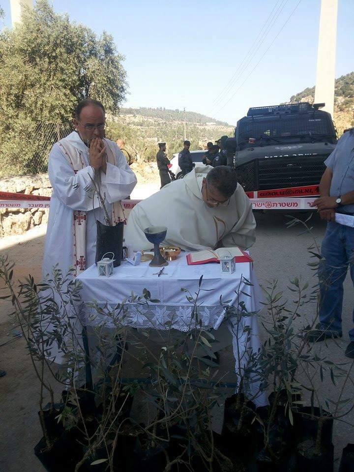 There is a Mass every Friday afternoon in the olive grove of Cremisan Valley to ask God to intercede on behalf on the people of Beit Jala. Note the chalice. That is a gift from us to them. They use it weekly, as they pray.