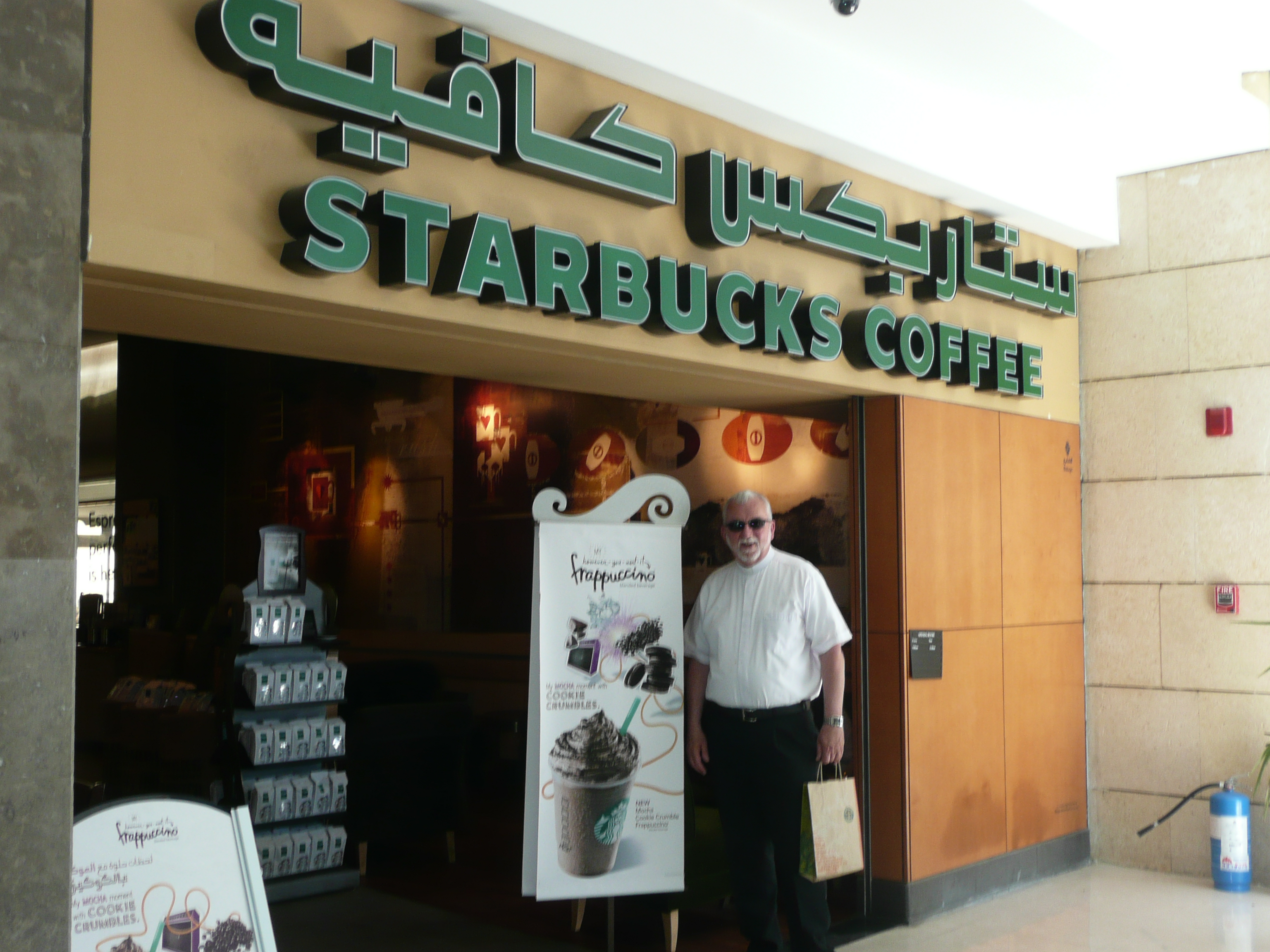 I was disappointed that I could not get a Dubai Starbucks gift mug for my friend, Paul. The Starbucks was in the other terminal! That was a disappointment for me. What was not a disappointment was the coffee and pastries at the “Costa” coffee counter with Cathy and Judy, enjoying “A” day with kindergarten teacher Michelle: Cathy with the “airplane” figure stenciled in cinnamon on top of the foam in her cappuccino, me with an “apple” custard muffin, and Judy sawing that she was sitting on her “a word that we do not type in polite company.”
